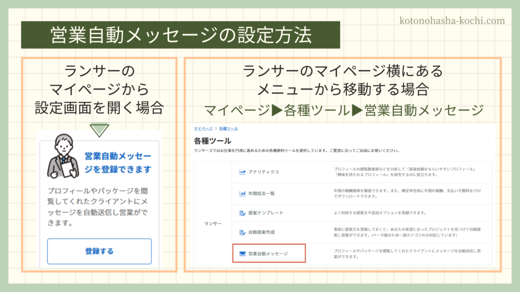 1.ランサートップページにある「営業自動メッセージを登録できます」からリンクをクリックするか、